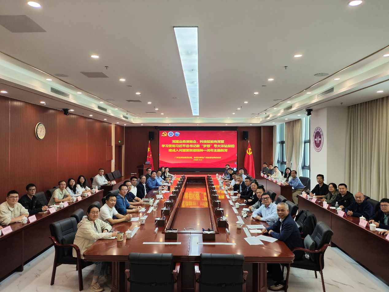 2025年12月9日,中國科學院廣州地球化學研究所(簡稱“廣州地化所”)深地過程與戰略礦產資源全國重點實驗室第二黨支部和先進環境裝備與污染防治技術全國重點實驗室黨支部,在黨委書記、副所長張海祥的帶領下,赴自然資源部廣州海洋地質調查局(簡稱“廣海局”)開展“黨建業務深融合,科技賦能向深藍——學習貫徹習近平總書記致‘夢想’號大洋鉆探船建成入列重要賀信精神一周年主題教育”黨日活動。廣海局天然氣水合物工程技術中心環境評價室黨支部書記梁前勇主持活動。