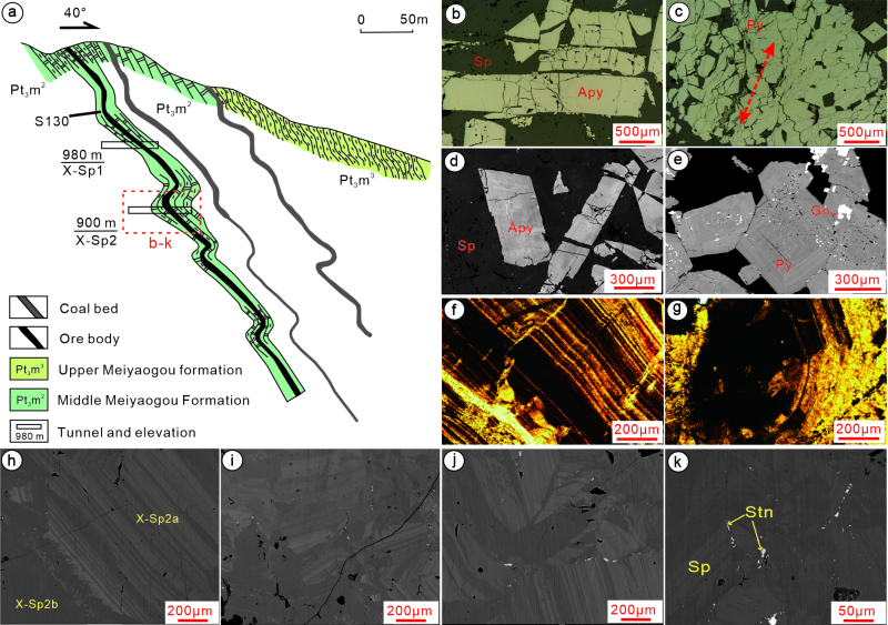 3. 對這類變形礦體中的硫化物開展的顯微觀察表明,產自礦體變形部位的硫化物多發生碎裂,暗示這些礦物遭受了應力破壞(圖1a-e)。其中,礦體變形部位的閃鋅礦明顯分為兩期,早期有環帶結構的閃鋅礦在被構造-流體改造后,又被晚期的閃鋅礦膠結(圖1f-k)。元素面掃描分析顯示,賦存在早期閃鋅礦中的銦(及其他微量元素)發生了活化、遷移,并向晚期的閃鋅礦中再次富集(圖2-3),從而導致礦脈變形部位的銦含量顯著提高。