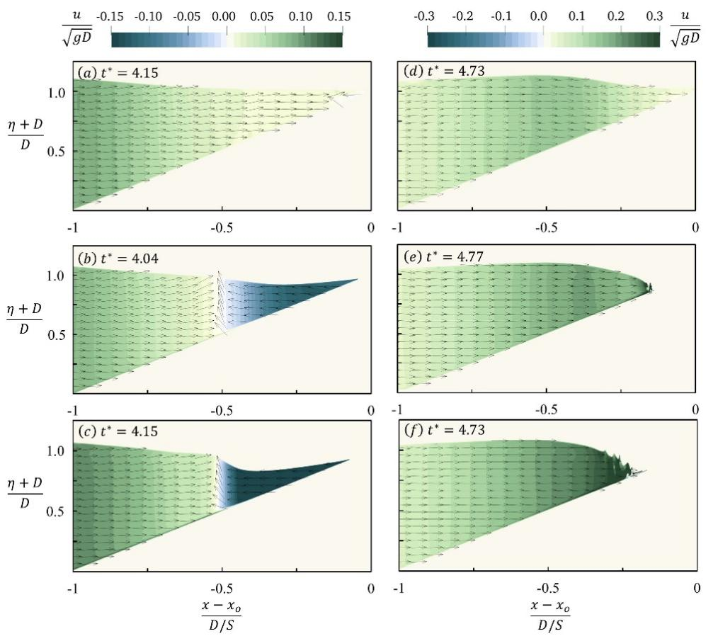 圖1:(a), (b)和(c)為海嘯波浪上岸至岸灘中段時的波形及流速場圖像,其中(a)無前置波谷;(b)前置波谷波幅較小;(c)前置波谷波幅較大。(d), (e)和(f)為波前抵達岸線位置且波浪破碎時的圖像。