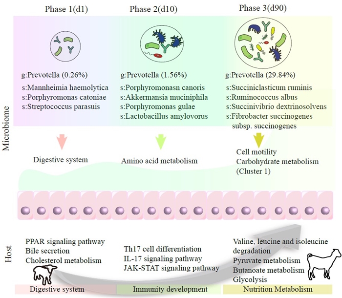 作為反芻動物的"發酵工廠",瘤胃依靠微生物-宿主的精密互作實現植物纖維資源的高效轉化。其中,粘膜附著微生物通過與宿主上皮細胞的直接互作,在營養代謝和免疫調控中發揮關鍵作用。然而,從新生到反芻成熟階段,宿主-微生物互作網絡的動態變化仍尚不清晰。因此,本研究采用轉錄組和擴增子等技術和構建互作網絡等分析手段,解析了從1日齡到90日齡的協同發育模式(圖1)。(1)粘膜菌群呈現“病原相關→粘液降解→纖維分解”的演替路徑。1日齡以Mannheimia等條件致病菌為主(占39.7%),10日齡Akkermansia muciniphila等粘液降解菌顯著富集(21.4%),至90日齡形成以Succiniclasticum ruminis等纖維分解菌為特征(58.3%)的成熟群落;(2)宿主粘膜呈現“免疫啟動→屏障塑造→代謝成熟”的發育軌跡。1日齡以先天免疫相關基因(TLR2/4、IL-17A、CXCL1/2/3等)高表達為主,10日齡則以粘液代謝核心基因(GCNT3、GAL3ST1)上調和抗氧化防御信號通路(JAK-STAT)激活為特征,至90日齡形成以代謝相關基因(ACADS、BDH1、HDAC)為主導的代謝網絡;(3)菌群-宿主互作呈現階段特異性模式,即在早期主要強調消化和免疫發育(如,Mannheimia等病原相關菌通過脂多糖-TLR4軸激活宿主固有免疫應答;菌群刺激Th17細胞分化,觸發IL-17/JAK2-STAT3通路保護早期粘膜完整性),而在后期則側重于增強營養代謝(如,纖維分解菌Succiniclasticum ruminis通過琥珀酸分流途徑提升丙酸產量,誘導宿主丁酸代謝酶基因BDH1上調)??傊?,瘤胃粘膜微生物與宿主的協同互作共同塑造了瘤胃生態系統。