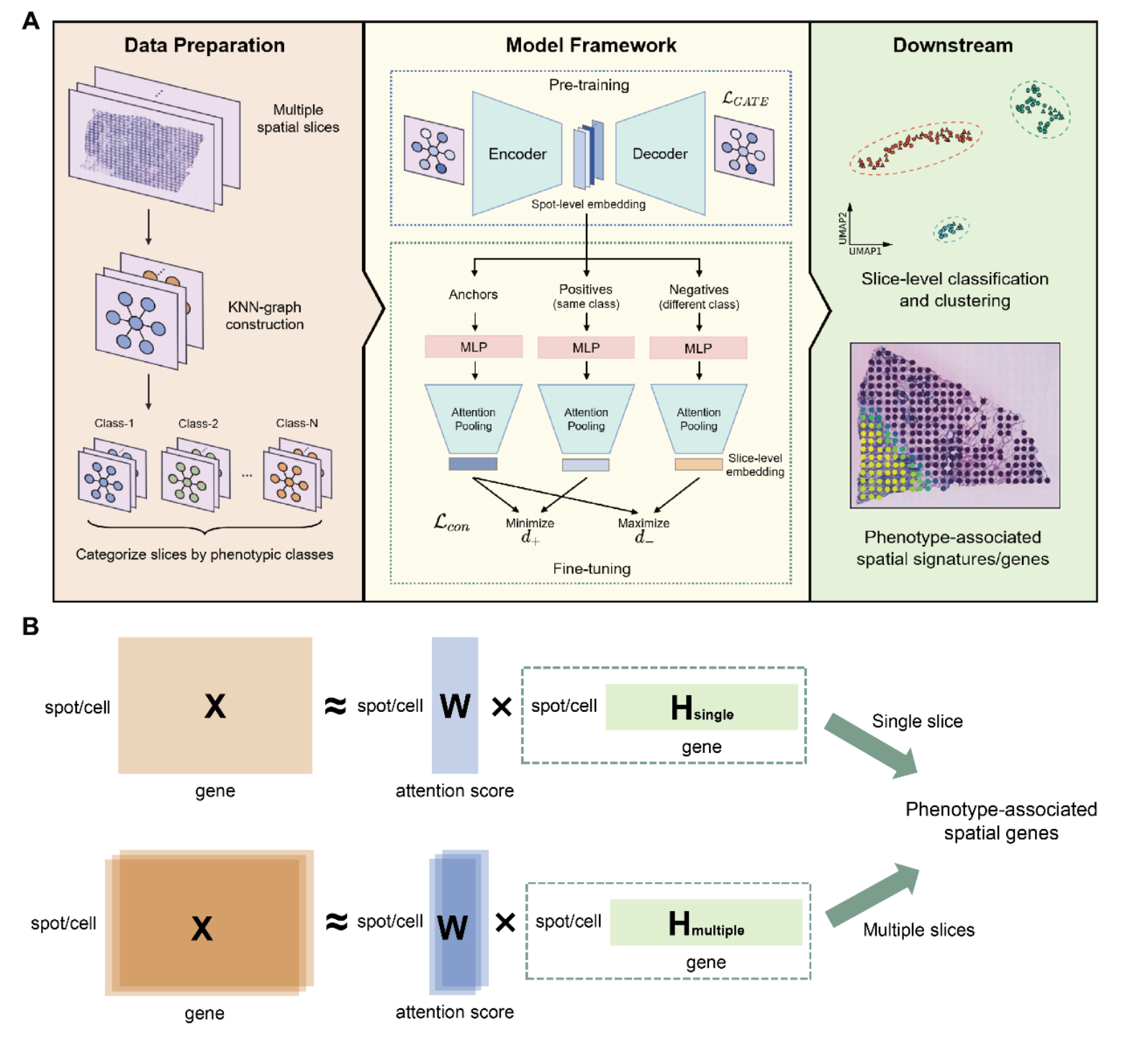 當(dāng)前的一些計(jì)算方法主要關(guān)注于單個(gè)或數(shù)個(gè)切片中細(xì)胞級(jí)別特征,對(duì)大量空間轉(zhuǎn)錄組學(xué)切片數(shù)據(jù)處理的效能不足。有別于此,PASSAGE提出基于多層次注意力的大規(guī)模異構(gòu)空間組學(xué)表征方法,從空間組切片(slice)、細(xì)胞與分子多個(gè)層次進(jìn)行不同粒度的表征學(xué)習(xí)與解析,有效增強(qiáng)了計(jì)算效率和可擴(kuò)展性。具體來說,PASSAGE在基于圖注意力自編碼器的細(xì)胞級(jí)表征基礎(chǔ)上設(shè)計(jì)了注意池化層(attention pooling layer),將同一切片的所有細(xì)胞加權(quán)融合成切片級(jí)表征,而后通過由表型信息指導(dǎo)的對(duì)比學(xué)習(xí)策略對(duì)切片級(jí)表征進(jìn)行優(yōu)化,并進(jìn)而采用非負(fù)矩陣分解方法獲得基因級(jí)別的注意力分?jǐn)?shù),從而實(shí)現(xiàn)對(duì)特定表型關(guān)聯(lián)空間組學(xué)特征的有效解析(圖1)。