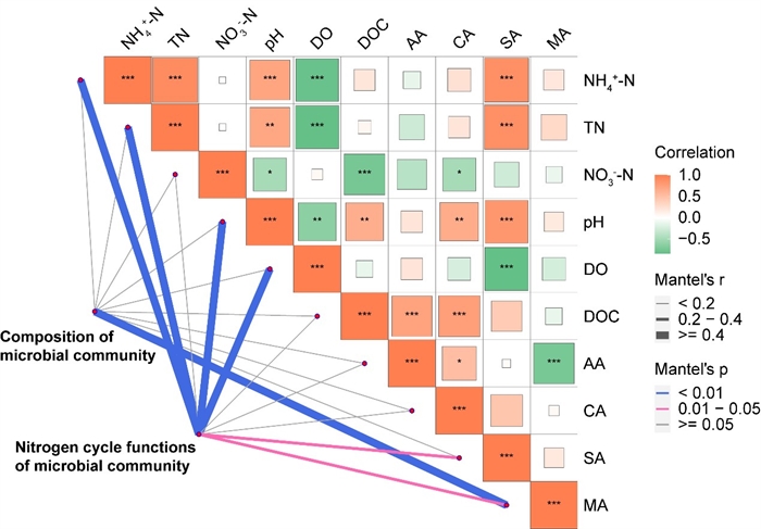 研究發(fā)現(xiàn):相比于美人蕉,梭魚(yú)草和黃菖蒲更適合處理含高濃度氮的養(yǎng)殖廢水。梭魚(yú)草和黃菖蒲根系分泌的溶解性有機(jī)碳(DOC)和總有機(jī)酸(TOA)在處理養(yǎng)殖廢水后分泌速率增加,而美人蕉則呈現(xiàn)相反趨勢(shì)。不同濕地植物根際微生物群落具有相同的優(yōu)勢(shì)門(mén),但其相對(duì)豐度上存在差異。在處理養(yǎng)殖廢水后微生物群落具有更加明顯的協(xié)同和共生關(guān)系。養(yǎng)殖廢水中的NH4+-N、TN濃度、pH、溶解氧(DO)含量以及根系分泌的丙二酸和琥珀酸可促進(jìn)根際低豐度的氮循環(huán)功能微生物生長(zhǎng),進(jìn)而增強(qiáng)微生物對(duì)氮素的降解能力,從而提高了人工濕地中氮的去除效率。本研究結(jié)果有助于進(jìn)一步理解高負(fù)荷污水處理過(guò)程中植物根際氮的去除機(jī)理,也對(duì)人工濕地系統(tǒng)處理高負(fù)荷污水的功能提升技術(shù)具有重要理論價(jià)值。