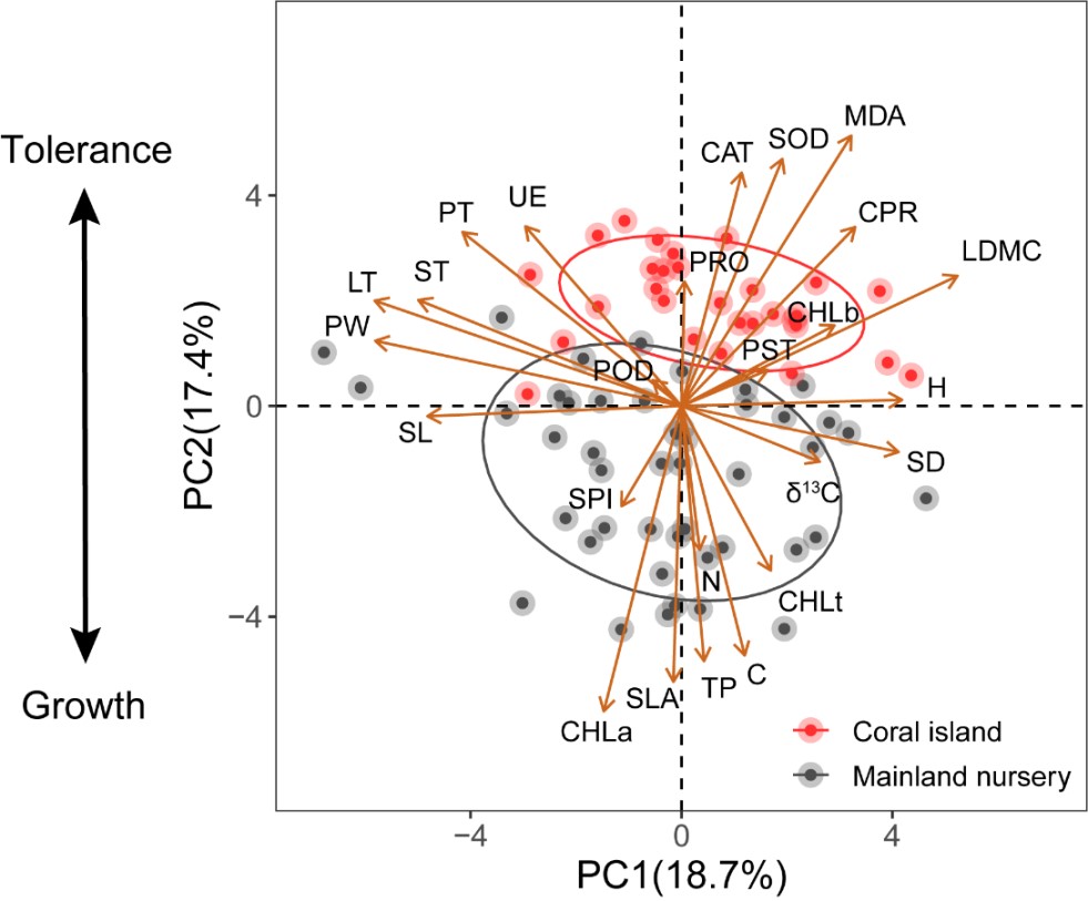 中國科學院華南植物園恢復生態學研究團隊的研究人員,以56種熱帶海岸帶典型植物物種為研究對象,通過野外實地測定和對比分析,系統研究了熱帶人工苗圃與熱帶珊瑚島兩種生境下植物結構與生理性狀的差異(圖1)。研究發現,與資源充足、生境良好的苗圃植物相比,熱帶珊瑚島植物采取了資源保守型策略,降低生長并顯著增強了抗逆性,優先分配有限的資源用于構建堅韌的葉片、提升抗氧化能力,以應對惡劣的環境條件(圖2)。同時,葉片厚度、株高、柵欄組織及海綿組織厚度與島上物種存活率呈現顯著相關性,可作為篩選熱帶珊瑚島植被恢復物種的關鍵性狀指標,并以此為基礎,推薦了海島生態恢復的適生物種名單。
