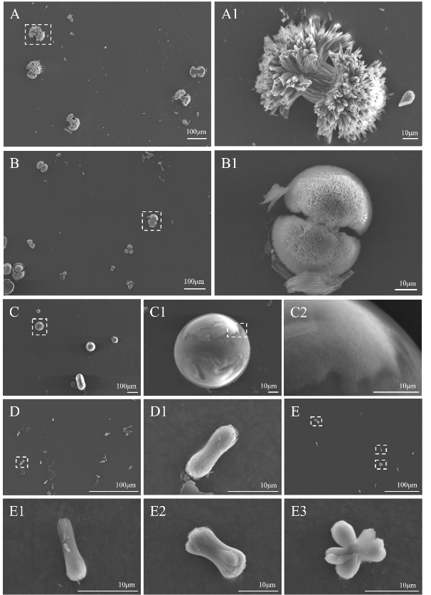 中國海伴溢蛤的外殼由文石片或微顆粒聚成復雜的不規則結構,分半透明內殼與非透明外殼,均多層疊合。內殼層由文石針狀垂直交錯結構與粒狀均質結構組成,且均質層中嵌有兩層薄肌棱柱層。橫截面顯“菊花”樣六角文石片堆疊,有黑洞和縫隙。外殼層為不同大小文石顆粒均質結構(圖3)。在本研究中,鑒定出266種SMPs,并通過和13種淺海貝類SMPs的比較發現了兩種核心的保守SMPs(AmSMP1和Pif-like),暗示了生物礦化功能的保守性。同時通過轉錄組和蛋白組序列比對,研究發現了一種特異性的SMP,命名為Am13,以及一種具有Kazal結構域的高度表達的SMP,命名為AmKaSPI。通過體外結晶實驗發現Am13負調控方解石形成,正向調控文石形成,同時在高濃度下抑制文石晶體大小生長。AmKaSPI通過增強成核和聚集以及誘導CaCO3晶體的形態變化,積極調節方解石和文石的形成,同時能促進方解石形態變化,形成十字星形結構(圖4)。這可能是SMP形成“菊花”狀棱柱層的關鍵。