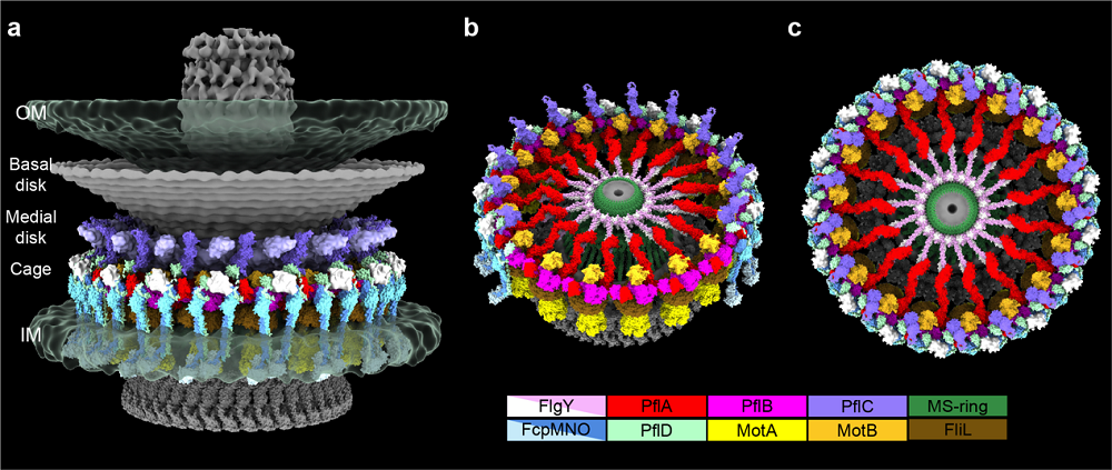 最近,研究團隊進一步構建了空腸彎曲菌復雜鞭毛馬達近乎完整的結構模型,解析了自1979年發現以來成分一直未知的周質E環、由FcpMNO和PflD組成的外周籠、以及PflA輻條-PflB輪圈復合體的精細結構及其互作細節。這些復雜支架結構通過精密的互作網絡,穩定了多達17個定子單元,從而產生超高轉矩,為鞭毛提供了強大的動力以適應復雜環境。