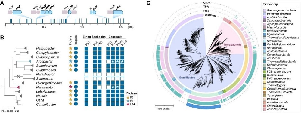 進化分析顯示,籠狀結構是彎曲菌門的特有結構,而E環和輻條結構廣泛存在于多種具有鞭毛的物種中,暗示其可能起源于細菌共同祖先,演化歷史久遠。研究進一步揭示,彎曲菌門自深海熱液口祖先開始,其鞭毛馬達“借用”了IV型菌毛系統的部分結構單元,形成了包裹定子復合體的輻條與籠狀結構,是細菌大分子機器演化過程中一次典型的“拓展適應(exaptation)”事件。