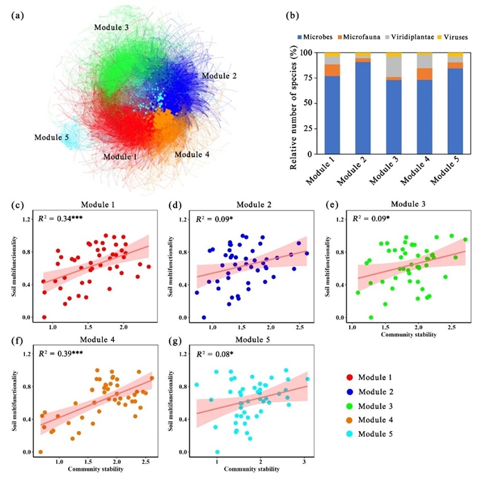 (3)土壤微動物穩(wěn)定性對土壤多功能性的貢獻大于微生物群落穩(wěn)定性。網(wǎng)絡分析進一步支持了這一結(jié)果,即具有更多的土壤微動物種類的網(wǎng)絡模塊解釋了更多的土壤多功能性的變化。