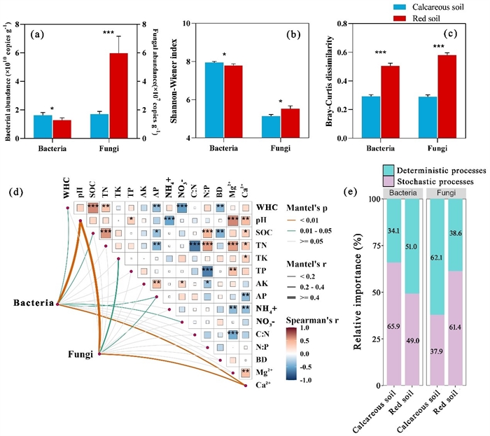 (1)石灰土土壤細菌豐度和多樣性顯著高于紅壤,而其真菌豐度和多樣性顯著低于紅壤;這可能歸因于隨機性過程主導了石灰土的細菌群落和紅壤的真菌群落的組裝,而這又與土壤pH值和Ca2+含量緊密相關(guān)。石灰土的凈氮礦化和凈硝化速率顯著低于紅壤,但反硝化潛力顯著高于紅壤。與還原反應(如硫、砷和硒的還原過程)相關(guān)的基因在紅壤中比在石灰土中更高表達。