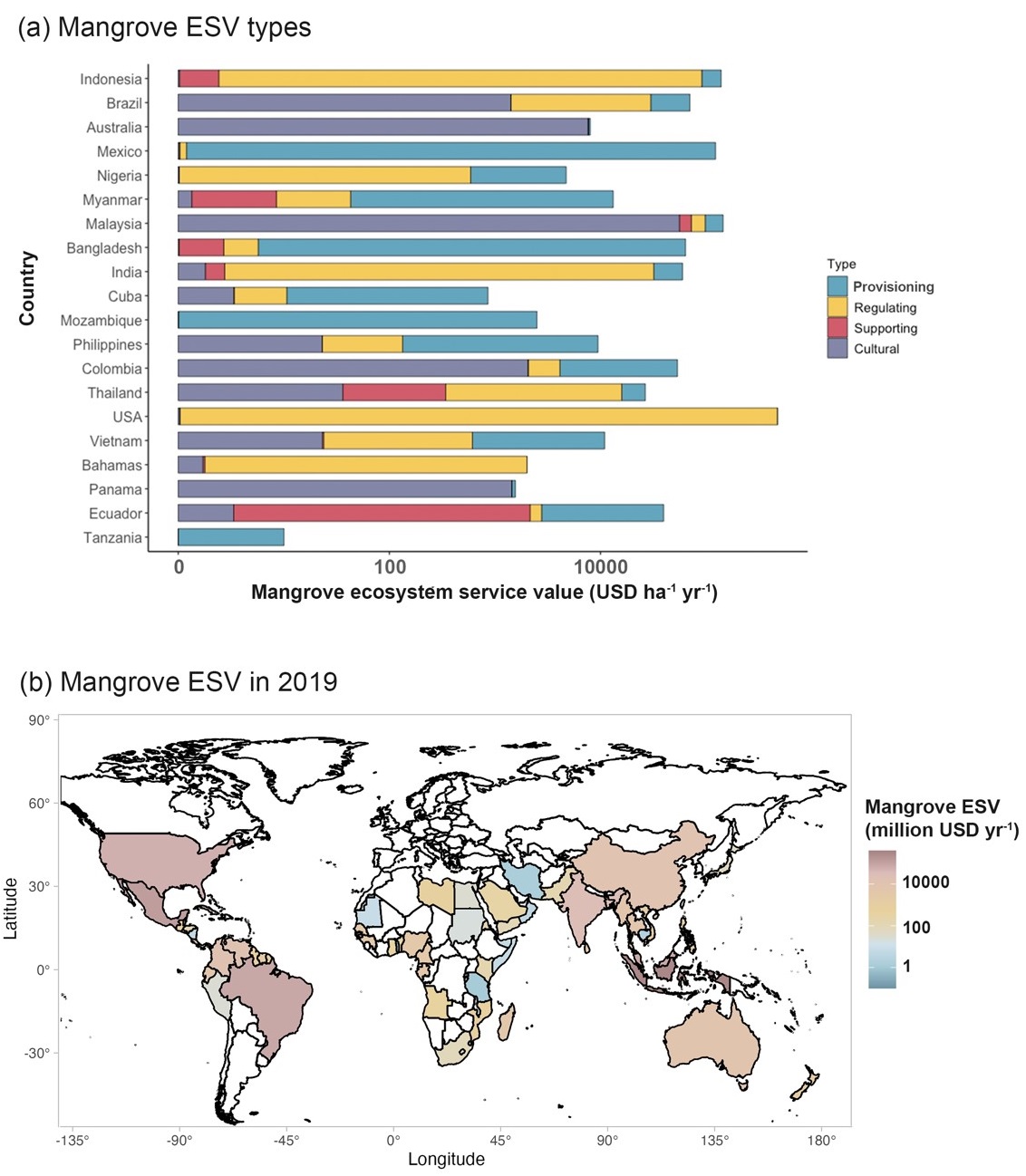 中國科學院華南植物園小良站生態研究團隊近日發布了一項關于全球紅樹林保護與恢復的最新研究成果。該研究表明,紅樹林不僅具有重要的生態價值,其經濟回報也遠超預期。紅樹林是地球上最獨特的生態系統之一,是重要的藍碳生態系統。研究指出,2019年全球紅樹林的生態系統服務價值(ESV)高達8940億美元,其中調節服務和供應服務分別占57.4%和19.7% (圖 1)。這些數據凸顯了紅樹林在調節氣候、保護生物多樣性和提供漁業資源等方面的不可替代作用。然而,研究發現,自1996年至2019年間,全球紅樹林的減少導致了約292億美元的生態系統服務價值凈損失。這意味著紅樹林的消失不僅對環境造成了嚴重破壞,還帶來了巨大的經濟損失。好消息是,恢復紅樹林的投資回報率驚人。在未來20年,預計紅樹林恢復將需要40億至521億美元的投資,但預期帶來的生態系統服務價值凈收益高達2310億至7250億美元。此外,通過藍碳交易,封存的19.4 Tg C 可能帶來0.69億至2.36億美元的額外收益。研究團隊還指出,紅樹林恢復項目的全球效益成本比(BCR)在6.35到15之間,顯示出極高的投資回報率。這表明,保護和恢復紅樹林不僅對環境保護至關重要,也是一項具有經濟可行性的投資。該研究成果為政策制定者、環保組織和公眾提供了重要的科學依據,強調了保護和恢復紅樹林的緊迫性和重要性。研究結果還填補了現有知識的空白,并為全球環境保護策略提供了新的視角。相關研究成果以“Getting the best of carbon bang for mangrove restoration buck”為題在線發表在綜合類學術期刊Nature Communications(《自然通訊》)上。中國科學院華南植物園可持續生態學團隊博士研究生張靖凡為論文的第一作者,研究方向負責人、小良站站長王法明研究員為論文通訊作者。該項研究得到國家自然科學基金項目、“一帶一路”國家與國際科學組織聯盟項目、國家重點研發計劃、中國科學院青年創新促進會項目和科技部“ONCE”海洋負碳排放大科學計劃資助。論文鏈接:https://doi.org/10.1038/s41467-025-56587-2圖1. 紅樹林提供的不同類別的生態系統服務價值。圖2. 全球紅樹林的生態系統服務價值變化。圖3. 全球紅樹林恢復所需要的投資以及通過藍碳交易獲得收益。圖4. 國家尺度的紅樹林恢復的收益投資比。